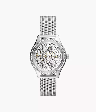 | Línea / Tipo | Fossil Jacqueline Automatic – Plateado con diseño esqueleto y malla milanesa |