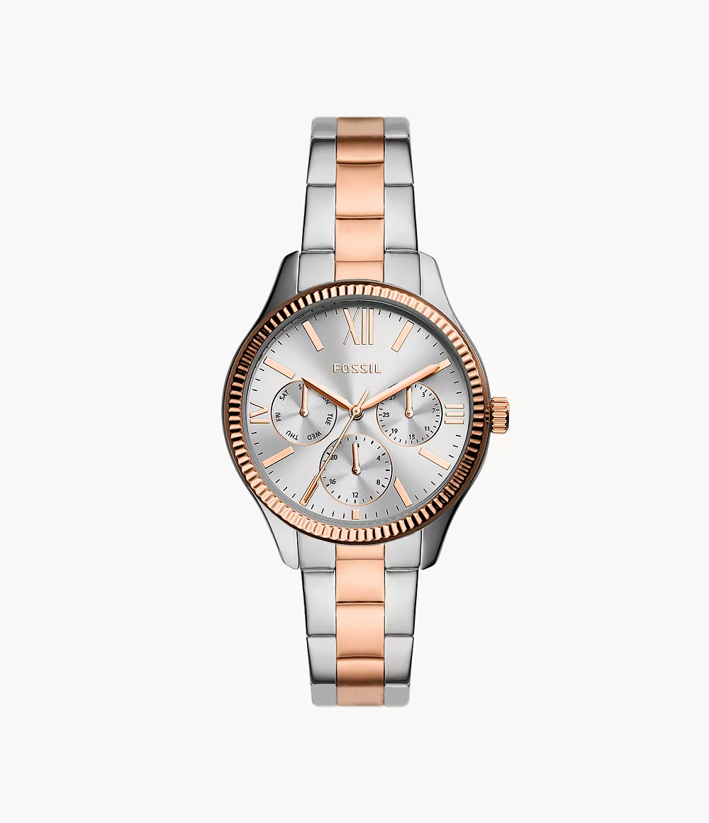El Fossil BQ3761 combina el encanto atemporal del acero bicolor con un diseño delicado y funcional. Su esfera clara y acabados dorados rosados lo convierten en una pieza versátil que complementa tanto atuendos formales como casuales con un toque de distinción.