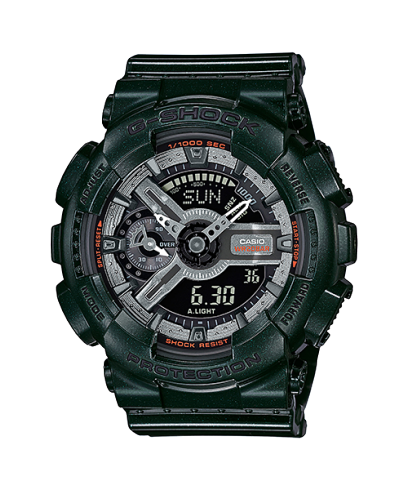 El Casio G-Shock GMA-S110MC-3A ofrece la estética angular del S110 en un formato más compacto, con un llamativo acabado verde oscuro y display negativo. Un modelo urbano, moderno y distintivo que combina estilo y resistencia.