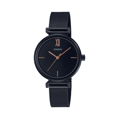 El Casio LTP-2023VMB-1 combina la delicadeza de un reloj joya con la modernidad del negro metálico. Su brazalete tipo malla y la pulsera bangle incluida le dan un toque de lujo discreto, ideal para mujeres que buscan un accesorio refinado y versátil. Perfecto para combinar con atuendos formales o minimalistas de noche.